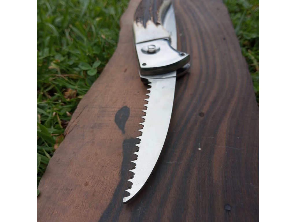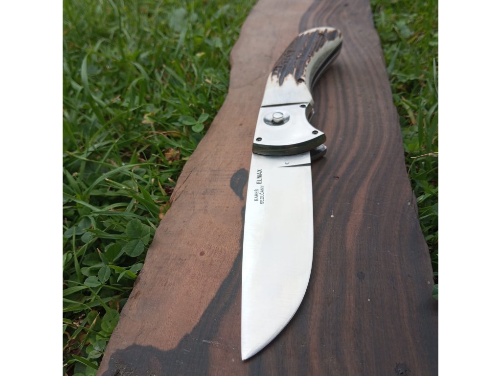 Na tento nůž používáme skvělou pracovní ocel ELMAX, která dosahuje tvrdosti 61HrC. Čepel je otáčecí s pilkou na druhé straně a má délku 100mm. Celková délka nože je 230mm. Jako tradiční materiál na střenku používáme jelení paroh ,ale protože děláme každý nůž ručně, není problém materiál změnit za kterýkoliv jiný vhodný jako například různé druhy dřevin či umělé hmoty jako je G10. Pokud se rozhodnete pro jiný materiál ,je třeba počítat s prodloužením doby dodání a telefonickou domluvou.